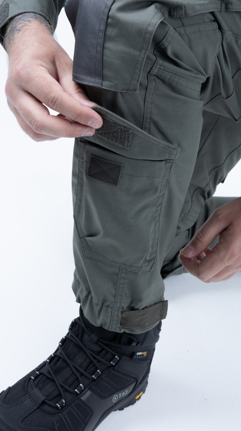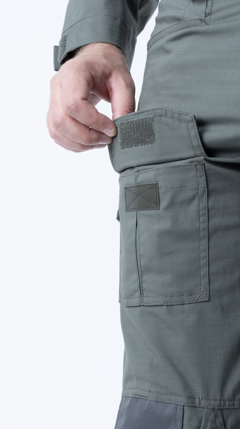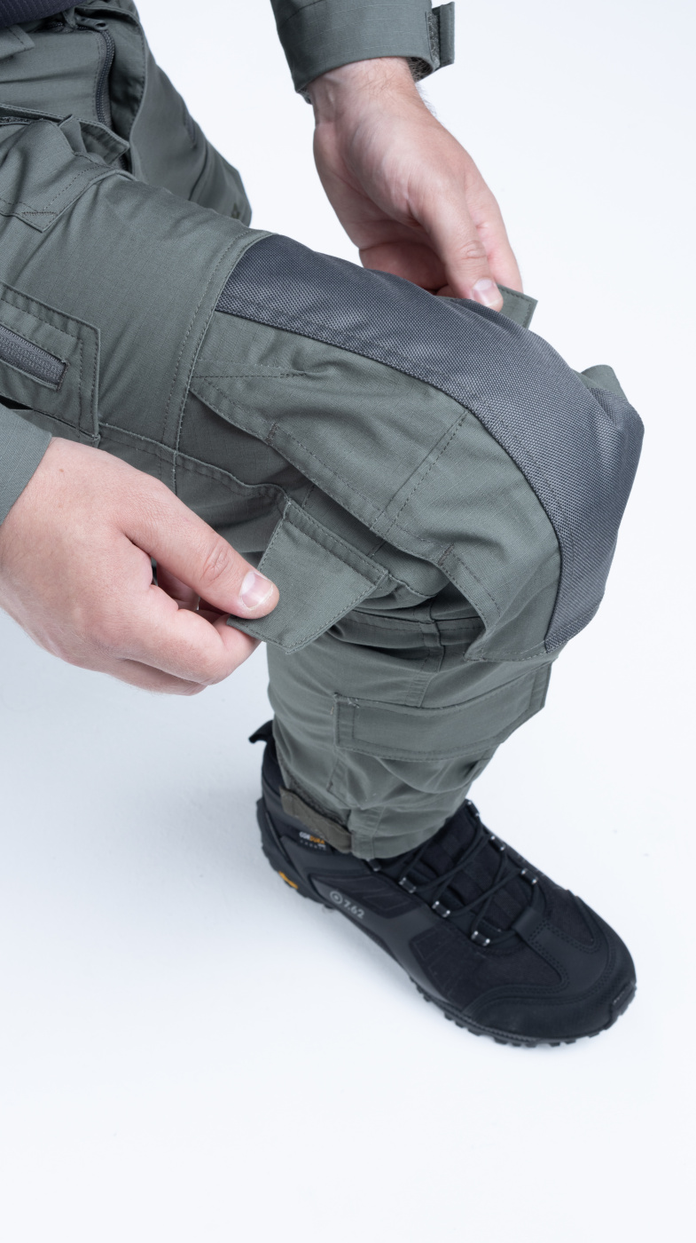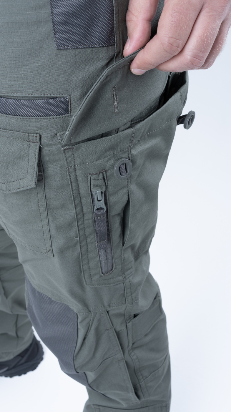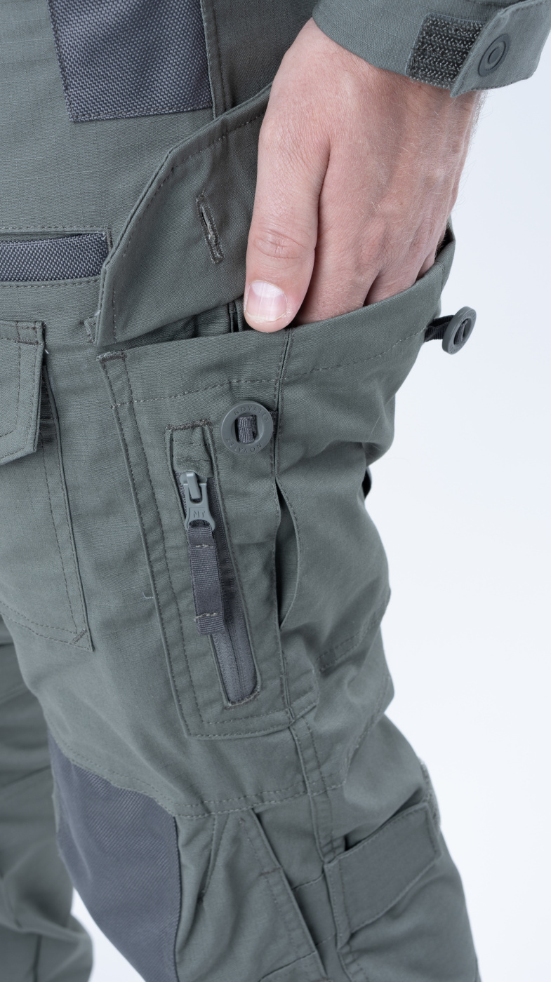 12 функциональных карманов, в том числе карманы для удобного использования в положении сидя. Зона колена усилена, предусмотрен отсек для наколенников. Тефлоновое покрытие упрощает уход за изделием.
