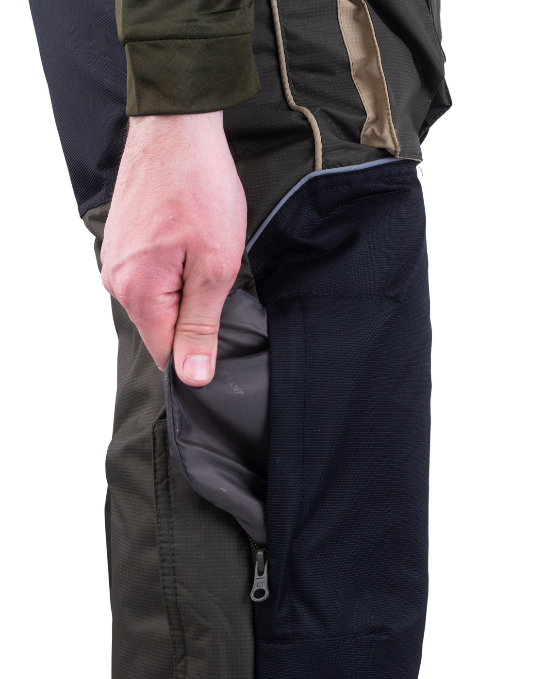 Куртки с большим количеством вместительных карманов и прочным капюшоном с козырьком. Низ рукавов на липучке. Брюки на регулируемых лямках, по низу утянуты резинками.
