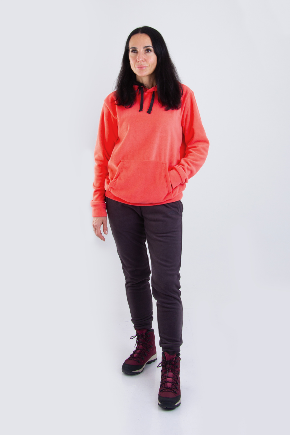 Костюм состоит из толстовки с капюшоном и брюк-джогеров, изготовленных из двухстороннего флиса плотностью 300 г/м², который обеспечивает невероятную мягкость и тепло. Толстовка выполнена в оверсайз-стиле, что добавляет ей непринужденности и стиля. Удобный карман кенгуру позволяет носить с собой мелкие вещи или просто согреть руки, а капюшон с регулировкой по лицевому краю на плоский шнур обеспечивает защиту от ветра и холода.
